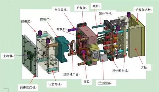 最后是頂出機構(gòu)。模具注塑好后的塑料件基本上留在型芯上,這時候就需要頂出機構(gòu)來頂出塑料件。頂出機構(gòu)通常是頂針,頂板或者頂塊之類的。