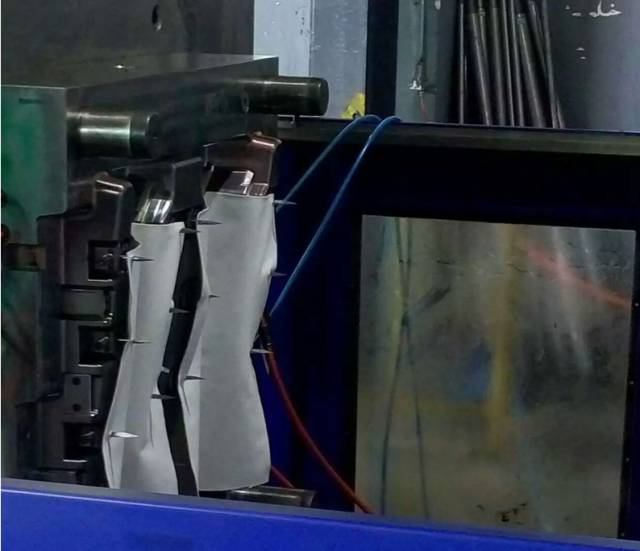 低壓注塑模具主要原理是注塑壓力較低在布上流動,開模時要先把布掛到前模掛針上,合模、注塑、然后取件。