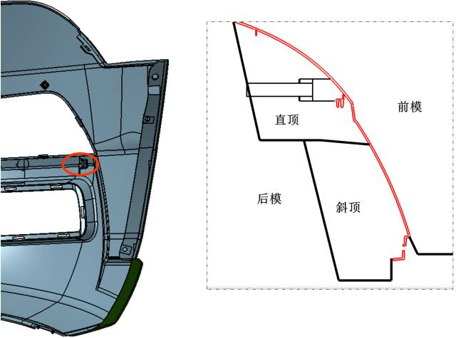 在汽車注塑模具中,針對汽車保險杠產品,模具設計時通常會采用先進的內分型面技術。其優(yōu)點是分型夾線隱藏在保險杠的非外觀面上,在汽車上裝配后看不到外觀夾線,不會影響產品外觀。但這種技術在難度與結構上都要比外分型保險杠復雜,技術風險也較高,模具成本與模具價格也會高于外分型保險杠很多,但因外觀美觀,在中高檔汽車中被廣泛應用。